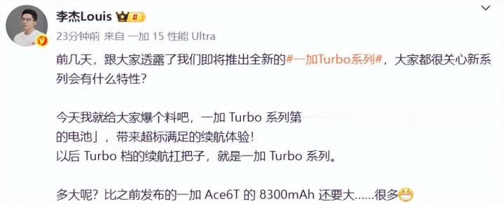 12 月 19 日,一加中国区总裁李杰通过外交媒体细致官宣全新家具线 ——Turbo 系列,并扔出一枚 “重磅炸弹”:该系列将配备远超 8300mAh 的 “超巨量电板”,径直宣告安卓手机续航竞赛投入新纪元!