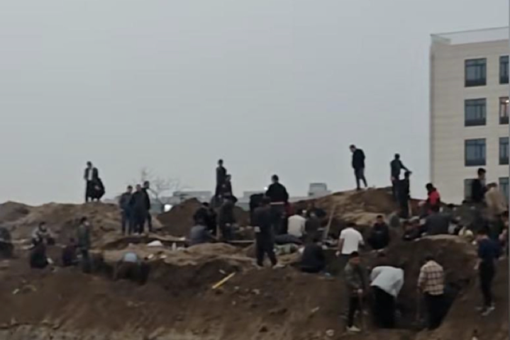 视频中娇傲,市民们佩戴铁锹、金属探伤仪等器具扎堆挖掘。