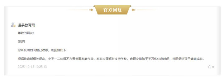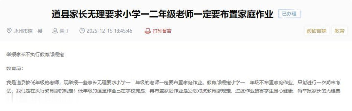 该网友自称是说念县教低年齿的别称小学老诚,他(她)遭受一些家长极度条件小学一二年齿的老诚一定要嘱托家庭功课,但讲明部规则小学一二年齿不嘱托家庭功课、只可进行一次期末查验,这些家长的条件让他们很为难。并示意针对低年齿学生的适量功课,在学校仍是完成了,再嘱托家庭功课即是公然抗拒讲明部规则、过度功课损伤学生身心健康了。