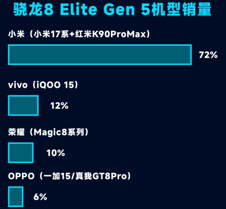 也等于说高通的骁龙8 Elite Gen5芯片的出货量,主若是由小米孝敬的,其它悉数品牌加起来孝敬的销量,齐还莫得小米的一半多。
